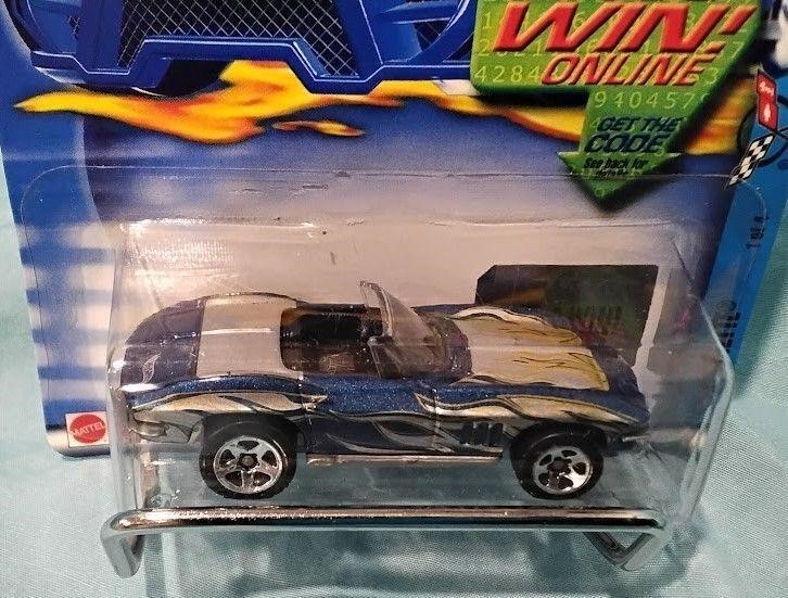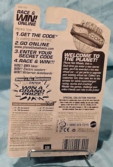 2002 Hot Wheels ’65 Corvette, Collector #014. Features a striking two-tone blue and silver paint scheme with white pinstripe accents. Factory-sealed in great condition.