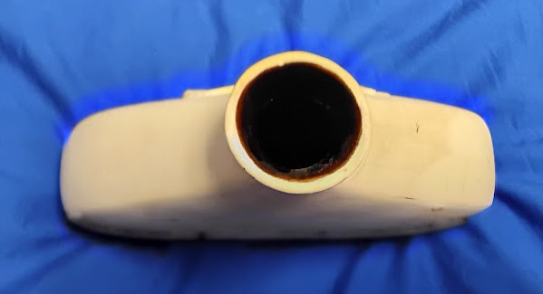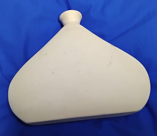Description: Unique ceramic vase or bottle in white bisque (unglazed) finish featuring embossed cougar head design in relief on front side. Teardrop or bulbous triangular shape with narrow neck opening and knob-style stopper top. Cougar profile shows detailed features including snout, eye, and fur texture molded into the clay. Back side is smooth and plain. Opening at top suitable for dried flowers, single stems, or decorative display. Bisque ceramic has matte unglazed surface giving it artistic handcrafted appearance. Bottom shows manufacturing marks. Some minor surface imperfections consistent with bisque ware. Could be painted or glazed for custom finish or left natural. Measures approximately 6-8 inches tall. Great for rustic cabin decor, wildlife enthusiasts, or ceramic painting project. Unusual cougar motif makes distinctive decorative accent piece.