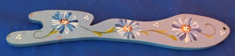Description: Charming hand-painted wooden oven rack puller featuring a whimsical curved design decorated with blue, white, and purple daisies with yellow centers and delicate vine accents. The piece has a light blue/aqua background with white dot details. This functional kitchen tool allows you to safely pull hot oven racks in and out without burning yourself. The hook end grabs the oven rack while the handle keeps your hand safely away from heat. Measures approximately 12-14 inches long. Beautiful folk art style painting adds decorative charm to a practical kitchen essential. Excellent condition.