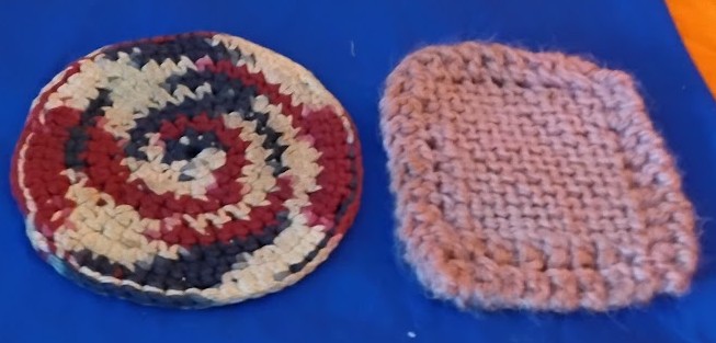 Description: Lot of 2 handmade crochet hot pads in contrasting styles. Includes one round patriotic-style trivet in red, white, navy blue, and cream colors with spiral pattern, and one square pink/coral hot pad with textured stitching. Both feature thick, heat-resistant construction perfect for protecting surfaces from hot dishes and cookware. The round pad measures approximately 7-8 inches diameter, square pad approximately 6-7 inches. Vintage or vintage-style pieces showing gentle use. Functional and charming addition to any kitchen. Machine washable.