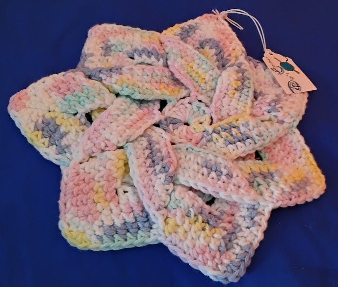 Description: Beautiful handmade crochet hot pad in soft pastel variegated yarn featuring pink, yellow, mint green, blue, and lavender colors. This decorative trivet measures approximately 8-9 inches and features a unique star or flower shape design with thick, heat-resistant stitching perfect for protecting countertops and tables from hot dishes. New with tags attached. Made with quality cotton or cotton-blend yarn. Excellent handcrafted quality with consistent, dense stitching throughout. Ideal for gift-giving or adding a cheerful pop of color to your kitchen. Machine washable and durable.