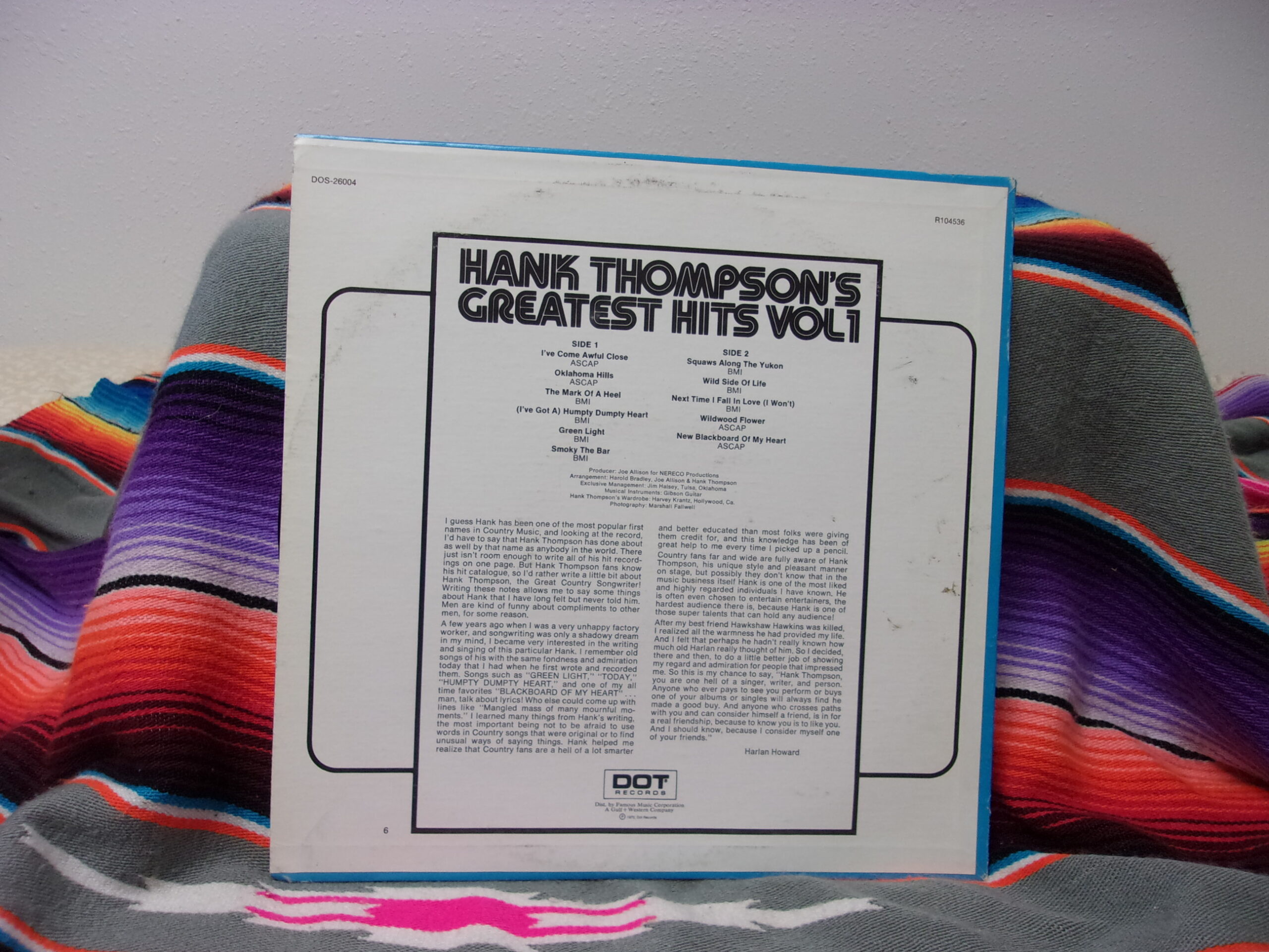 HANK THOMPSON’S GREATEST HITS VOL. 1 VINYL LP ALBUM 1972 DOS-26004