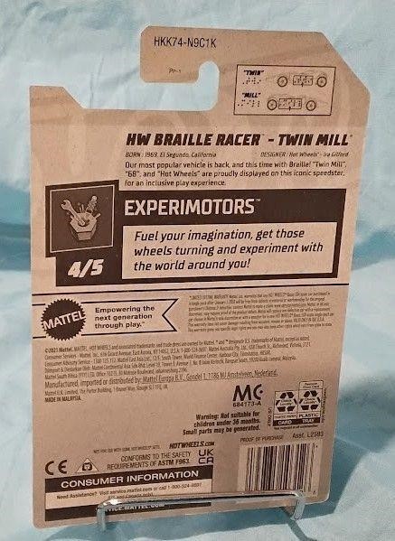 The car features “Twin” and “Mill” written in Braille on the sides, “#68” on the back, and “Hot Wheels” on the base. Even the blister pack includes Braille text on the front and back, making this a truly inclusive and highly collectible “all drivers welcome” piece.