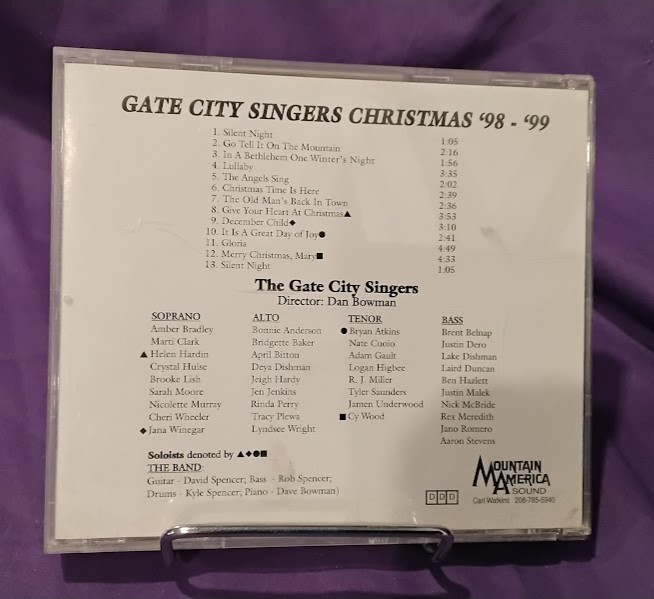 Gate City Singers presents “The Old Man’s Back In Town” Christmas ’98-’99 CD. Holiday choral album featuring 13 tracks including “Silent Night,” “Go Tell It On The Mountain,” “In A Bethlehem One Winter’s Night,” “I Wonder As I Wander,” “The Angel’s Song,” “Christmastime Is Here,” “The Old Man’s Back In Town,” “Give Your Hearts At Christmas,” “O Holy Night,” “It Is A Great Day of Joy,” “Gloria,” “Merry Christmas, Man,” and “Silent Night.” Director Dan Bowman. Mountain America Sound. CD in good condition with case.