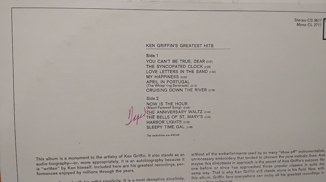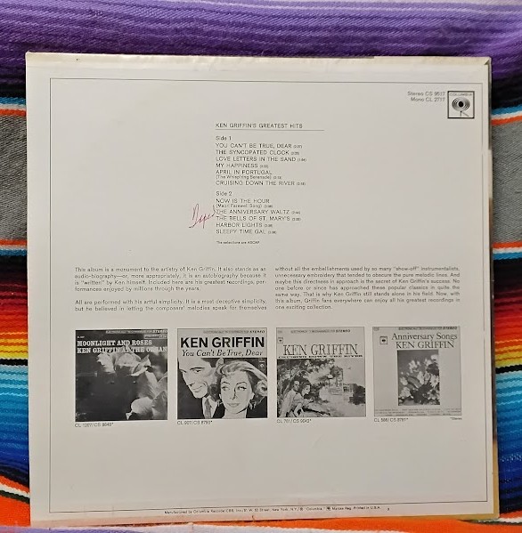 Ken Griffin Greatest Hits Vinyl Record Columbia 1967 CS9517