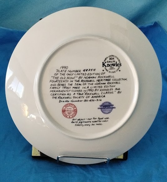 Hashtags: #NormanRockwell #TheOldScout #CollectorPlate #KnowlesChina #LimitedEdition #RockwellHeritage #1990Collectible #BoyScouts #ScoutingArt #VintageCollectibles #DecorativePlate #AmericanaArt #RockwellClassic #RockwellSociety #CampfireStories #FineChina #AuctionFinds #EstateAuction #ScoutMemorabilia #HeritageCollection