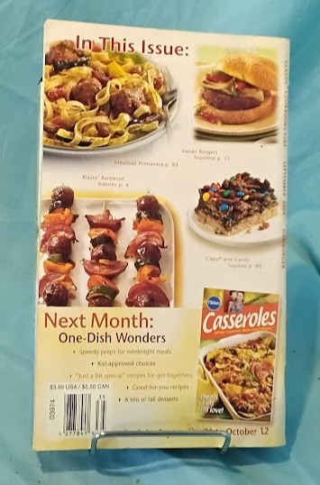 Description: Pillsbury Easy Back-to-School Meals: Hamburger recipe collection featuring a photo of every recipe. This issue focuses on quick and easy ground beef recipes perfect for busy families. Includes Confetti Taco Chili and many other kid-approved hamburger dishes. Features speedy preps for weeknight meals, kid-approved choices, and “just a bit special” recipes. “Divide the Work, Double the Meals” theme helps busy cooks maximize efficiency. Next month’s preview: One-Dish Wonders. Retail $3.99 USA/$5.50 CAN. Good condition with minor wear.
