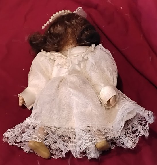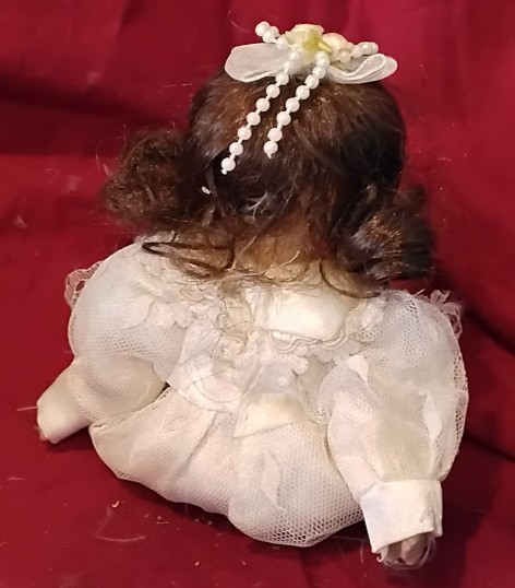 Porcelain Baby Doll White Lace Dress Brown Hair Sitting