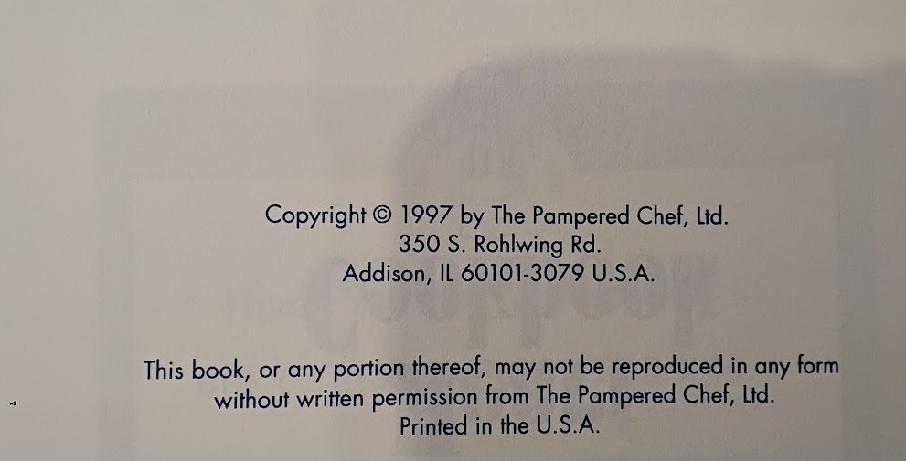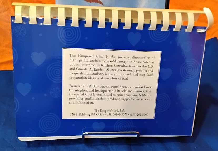 Recipes from the Heart Cookbook by The Pampered Chef, Ltd. – Spiral-bound cookbook featuring quick and easy recipe demonstrations from Pampered Chef Kitchen Shows. Published in 1997 by the premier direct-seller of high-quality kitchen tools. Founded by educator Doris Christopher in 1980 and headquartered in Addison, Illinois. This cookbook showcases recipes designed to work with Pampered Chef’s signature kitchen products. Perfect for home cooks looking for simple meal preparation ideas and entertaining inspiration. Features attractive blue cover with decorative design. Good condition vintage spiral-bound cookbook.