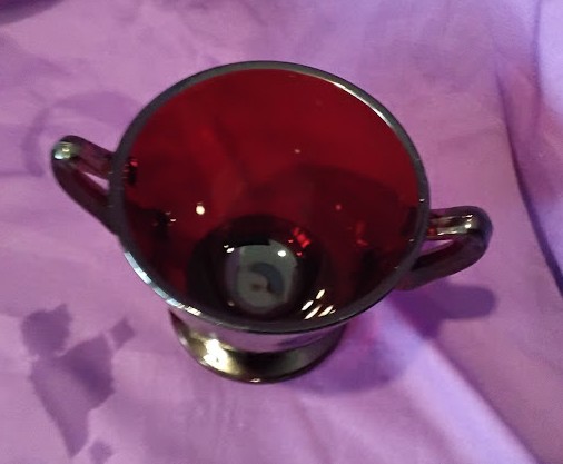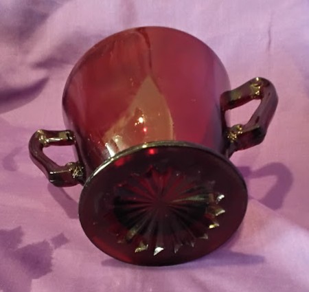 Description: Ruby red glass sugar bowl with two handles and footed base. Deep cranberry color with beautiful light transmission. Features decorative starburst pattern on bottom. Double-handled design with pedestal foot. Approximate 3-4 inches tall. Good vintage condition with no visible chips or cracks from photos shown. Classic depression-era style glassware. Perfect for serving sugar, candy, condiments, or decorative display. Elegant addition to table setting or vintage glassware collection. Beautiful piece for entertaining or collection.