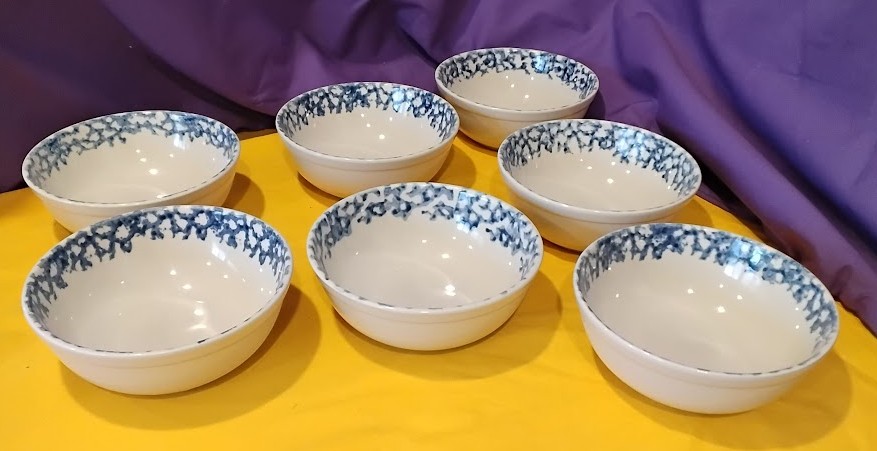 Pattern: White porcelain with a blue, hand-painted-look speckled or sponge-painted rim. The pattern is similar to classic “spongeware” designs. * Use: Perfect for cereal, soup, ice cream, or small side dishes.
