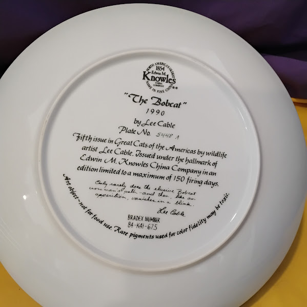 Hashtags: #CollectorPlate #LeeCable #BobcatArt #WildlifeArt #KnowlesChina #LimitedEdition #1990 #GreatCatsOfTheAmericas #VintagePlate #WildlifePlate #DecorativePlate #AnimalArt #LynxArt #90sCollectibles #NatureArt