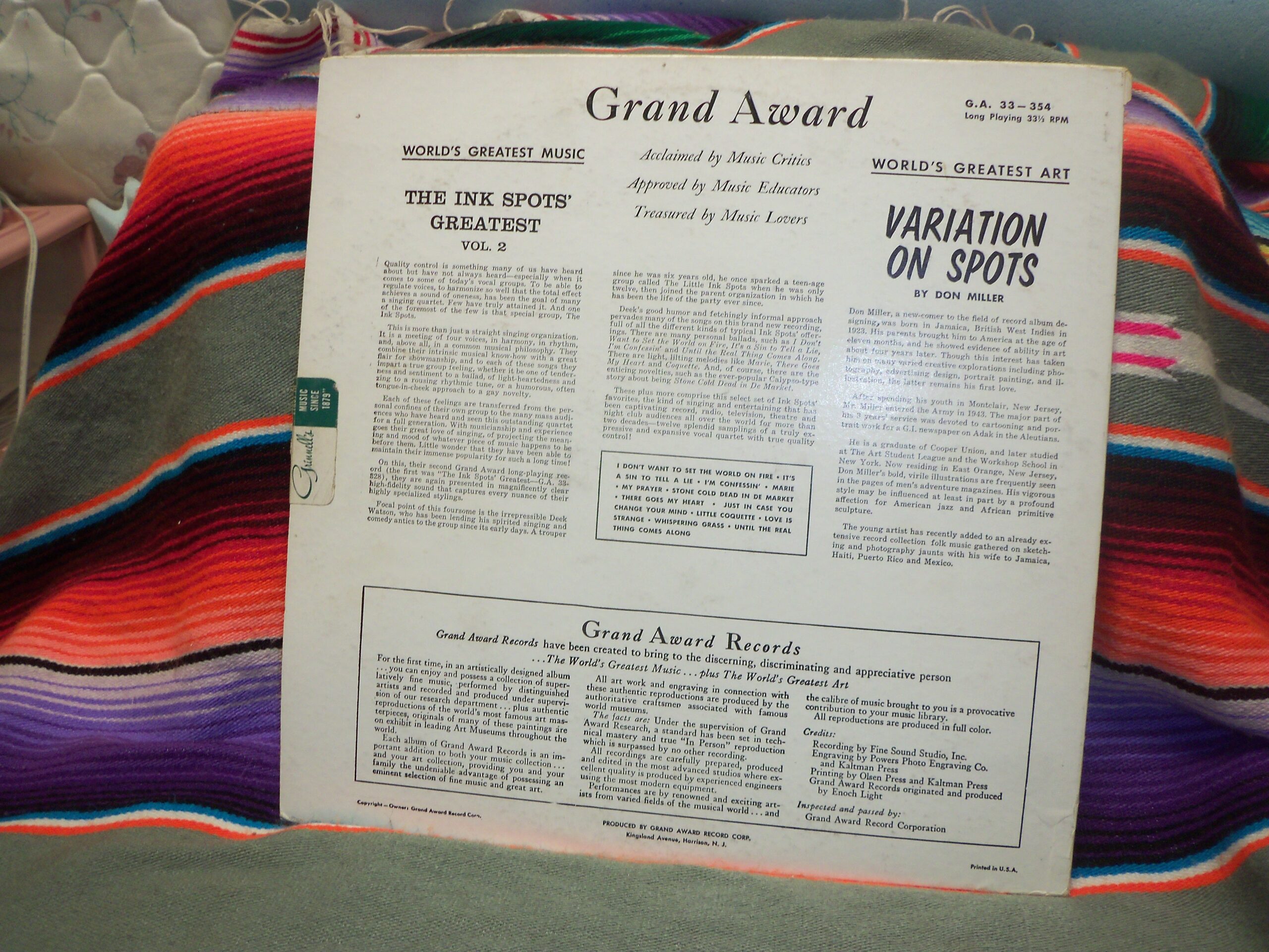 Relive the Golden Age of Vocal Harmony! This is an original 1958 pressing of The Ink Spots’ “Greatest” Vol. 2 on Grand Award Records (G.A. 33-354). The vinyl is in VG+ condition with some light surface marks that do not affect playback. The cover shows some minor ring wear (see photos). This LP features classic tracks like “I Don’t Want To Set The World On Fire,” “My Prayer,” and “Whispering Grass.” A must-have for any serious collector!
