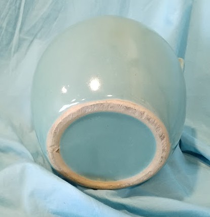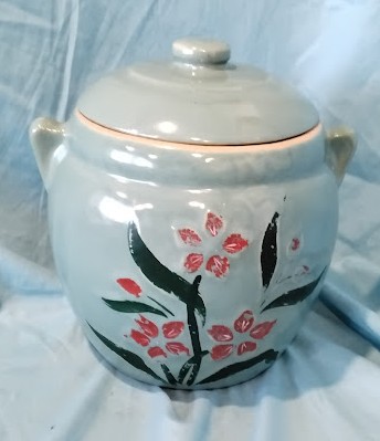 Description: Vintage ceramic cookie jar in soft blue glaze with hand-painted pink floral and green leaf design.