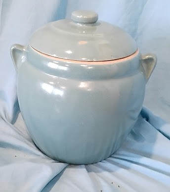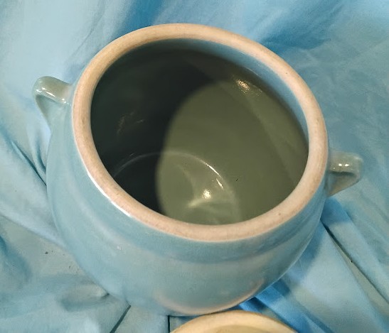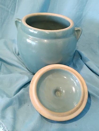 Features dual side handles and fitted lid with knob. Cream or tan colored rim accents. Shows age-appropriate crazing and wear. Unmarked pottery piece with charming mid-century cottage appeal.