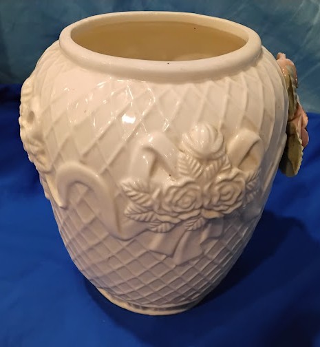 Description: Beautiful vintage ceramic ginger jar with lid featuring delicate applied pink roses and green leaves on cream-colored body. Intricate lattice and floral relief pattern covers the entire piece.