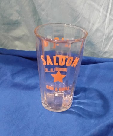 Fun vintage drinking glass featuring “SALOON” text with star logo and “BAR & GRILL” in orange and blue graphics. Clear glass with retro-style typography and design elements. Standard pint/beverage glass size, approximately 5-6 inches tall. Bold orange lettering with blue accents creates eye-catching vintage bar aesthetic. Perfect for home bar decor, man cave, retro kitchen, or Americana collection. Graphics show some wear consistent with vintage use – adds authentic character. No visible chips or cracks noted. Great conversation piece or functional barware. Captures classic American saloon and diner nostalgia. Ideal for collectors of vintage advertising glasses or themed barware.