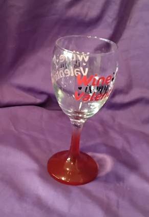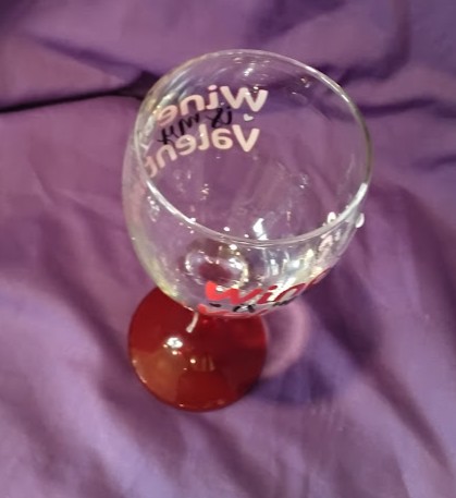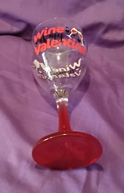 Description: Fun novelty wine glass with humorous Valentine’s Day theme featuring “Wine is My Valentine” text with heart designs. Clear glass bowl with colorful lettering in red, white, and black. Distinctive red/burgundy colored stem and base adds festive touch. Standard wine glass shape with rounded bowl suitable for red or white wine. Perfect for Valentine’s Day celebrations, Galentine’s parties, anti-Valentine’s gatherings, or wine lovers with sense of humor. Makes great gift for single friends, wine enthusiasts, or anyone who appreciates funny barware. Glass construction shows some minor wear. Measures approximately 7-8 inches tall. Playful alternative to traditional romantic Valentine’s gifts. Great conversation starter at parties or casual get-togethers. Functional drinkware with personality. Ideal for those celebrating self-love and wine appreciation on February 14th.