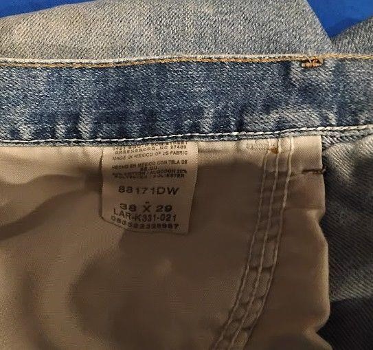 Description: Wrangler men’s denim jeans in medium blue wash. Size 38×29.